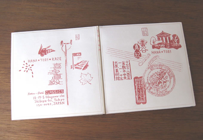 ハナ ジャケットの表と裏/ハナトリ と ハナトリカゼ 三人それぞれに対応したはんこがある そうすると 表と裏に 同じはんが重複してしまう それではそうとううっとうしい と思案のすえ 裏に重複する分のハナとトリは絵にしたら というのは蜂谷さんのアイデア 当事者の発想はぴたり 蜂谷さんが身振りを交えて説明してくれた田中さんのイメージ |