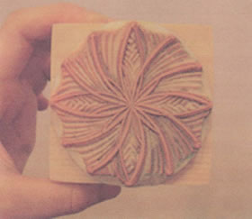| □ワークショップに参加した人々の作品と手前には、デザイン・ナイフ。どれもキレイで思わずビックリ!自分だけの模様が作れるなんて……。 | □These stamps were made by her workshop participants. Below you see the special design knife for carving. These designs look all so wonderful! And everybody can do it …… |