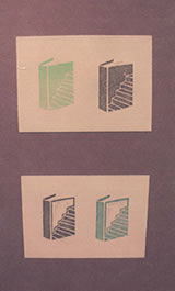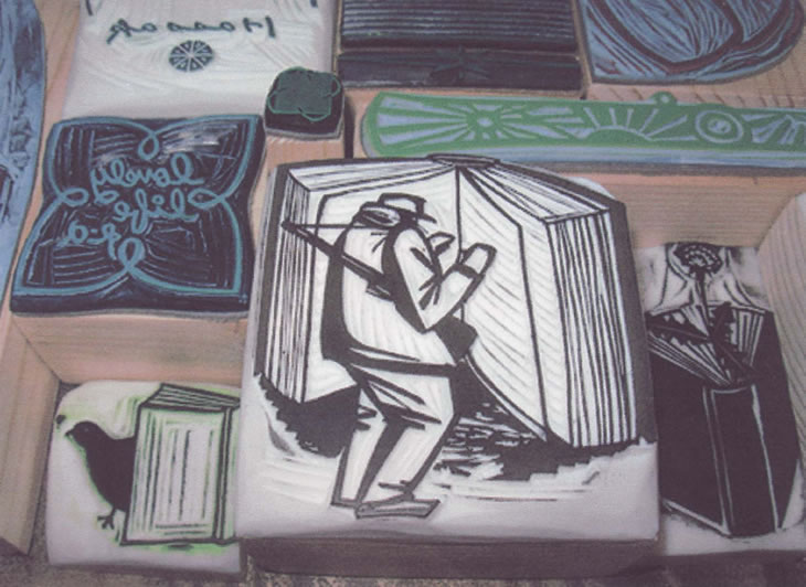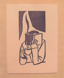 | □コーヒーを片手に本を読む人の姿。コーヒーの匂いやゆったりした時間が、このゴム版の絵から漂って来そう……。 |