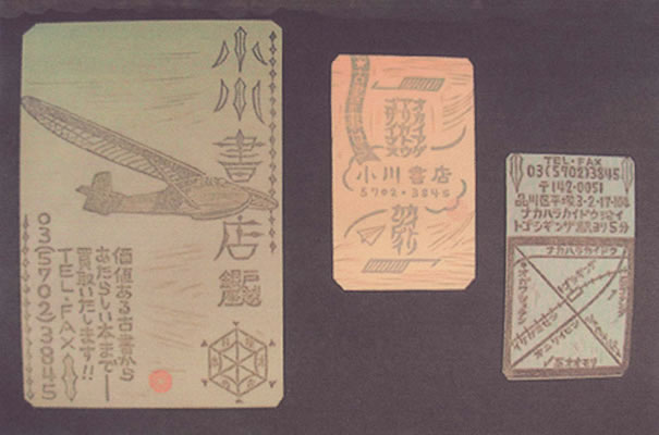 | 例えばこれは、小川書店という戦争関係の資料を取り扱っている本屋さんのオーダーメイドのハンコなのですが、お店の方から飛行機を入れて欲しいという要望があり、そのお店の資料にあった航空三面図を版にしました。その資料には、他にも面白い図柄が沢山載っていたので、個人的にも色々彫ってみました。古本にある絵は版との相性も凄く良いんですよね。 | For example, these are custom-made stamps ardered by the "Ogawa" bookstore that has also some books on war on its shelves. The shop wanted a something with an airplane as design. So, I ended ap making the stamps from templates I found in this bookstore's magazines and books. I also found a lot of other interesting graphics there which I later used for my own designs. I noticed that graphics in old books work extremely well as templates for my rubber stamps. |